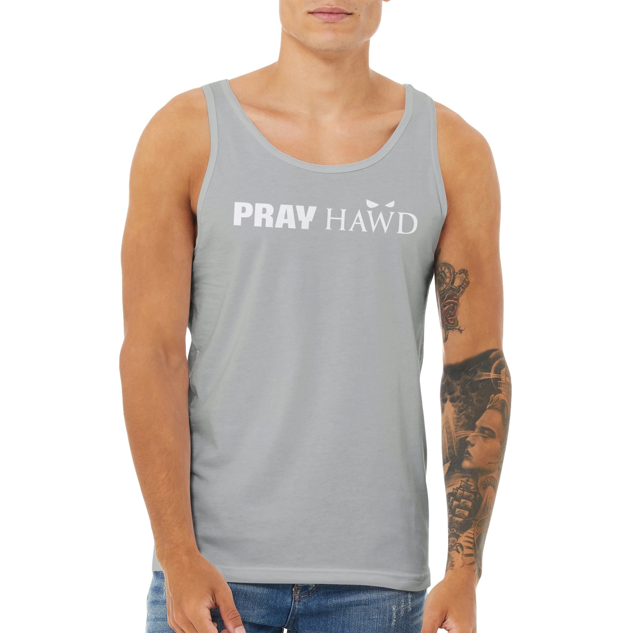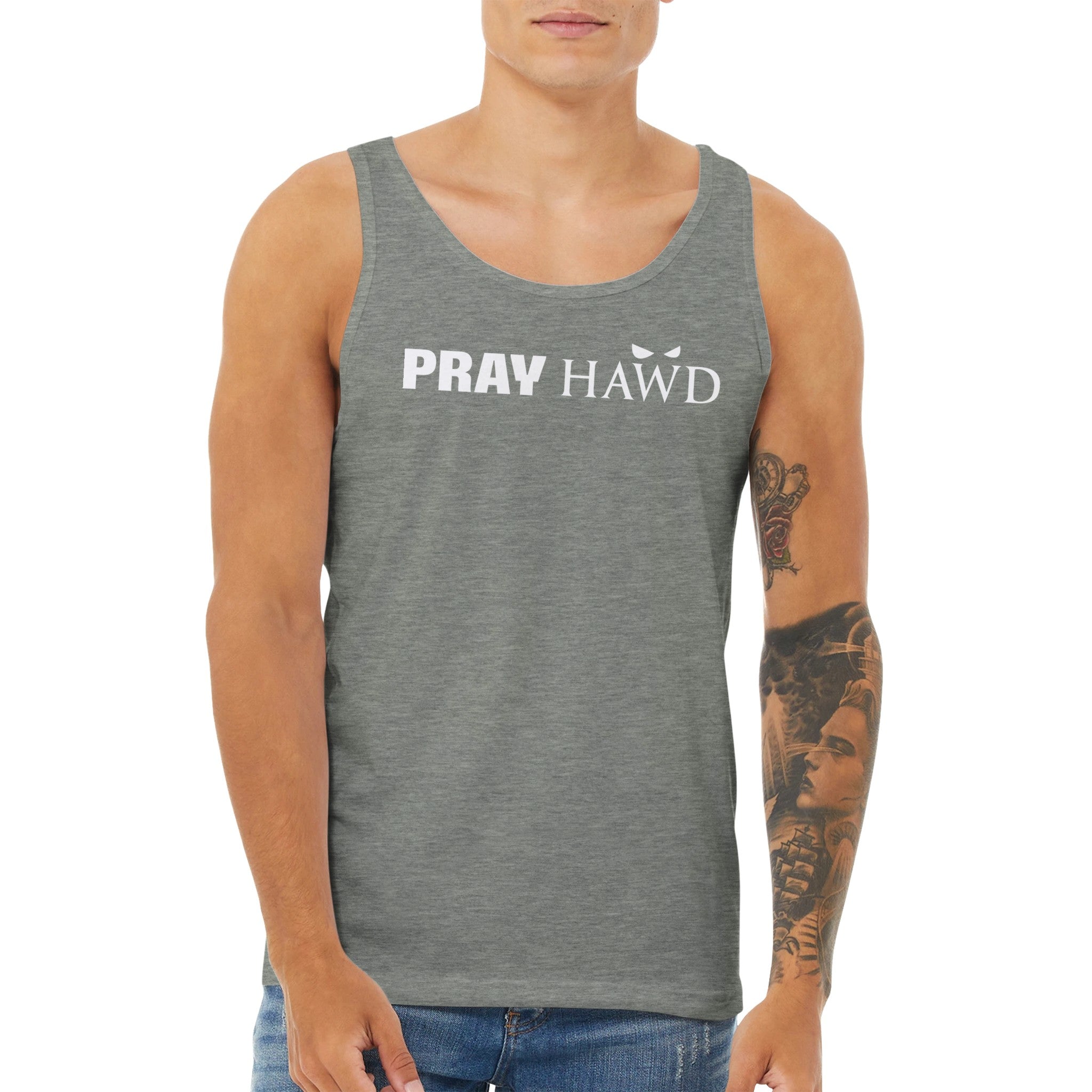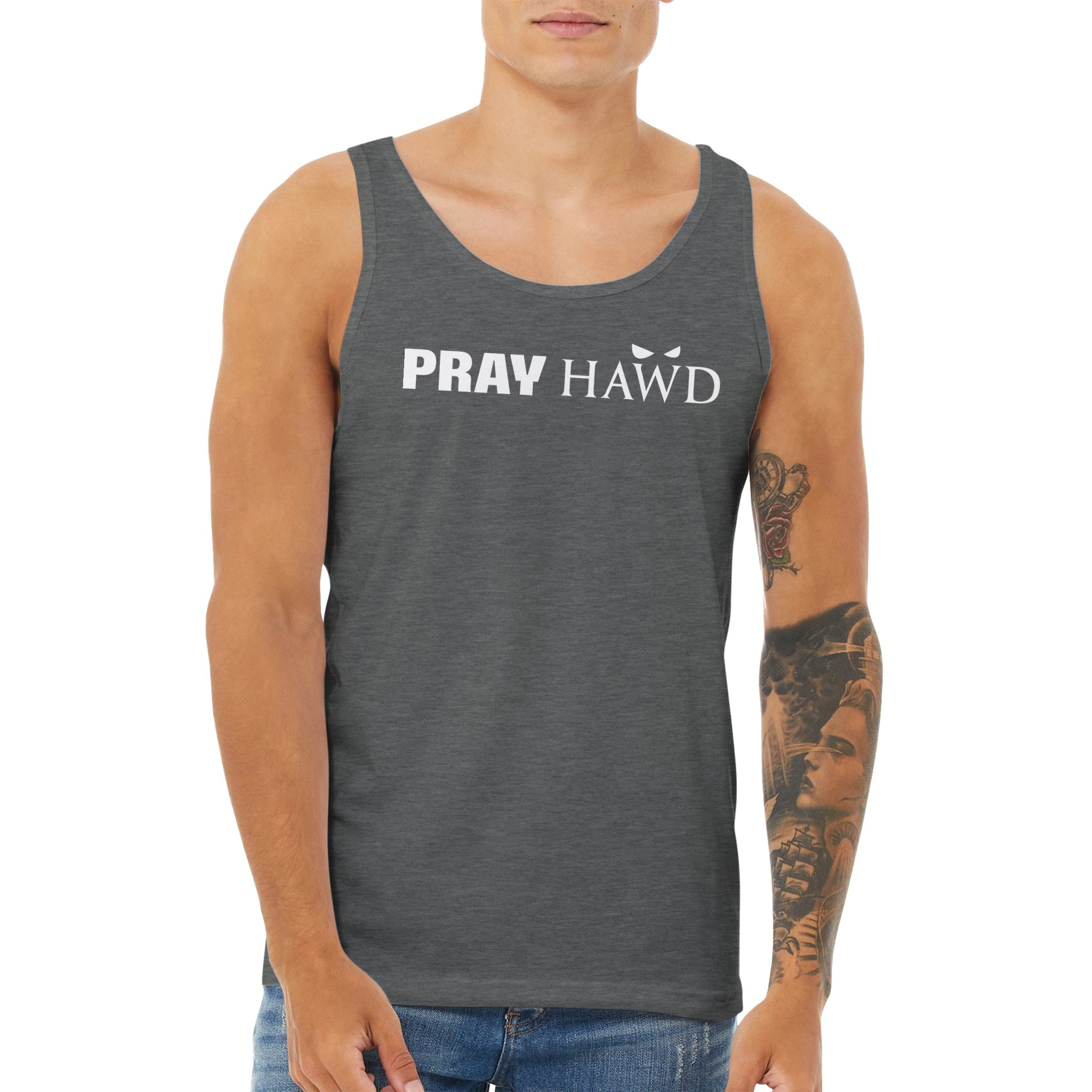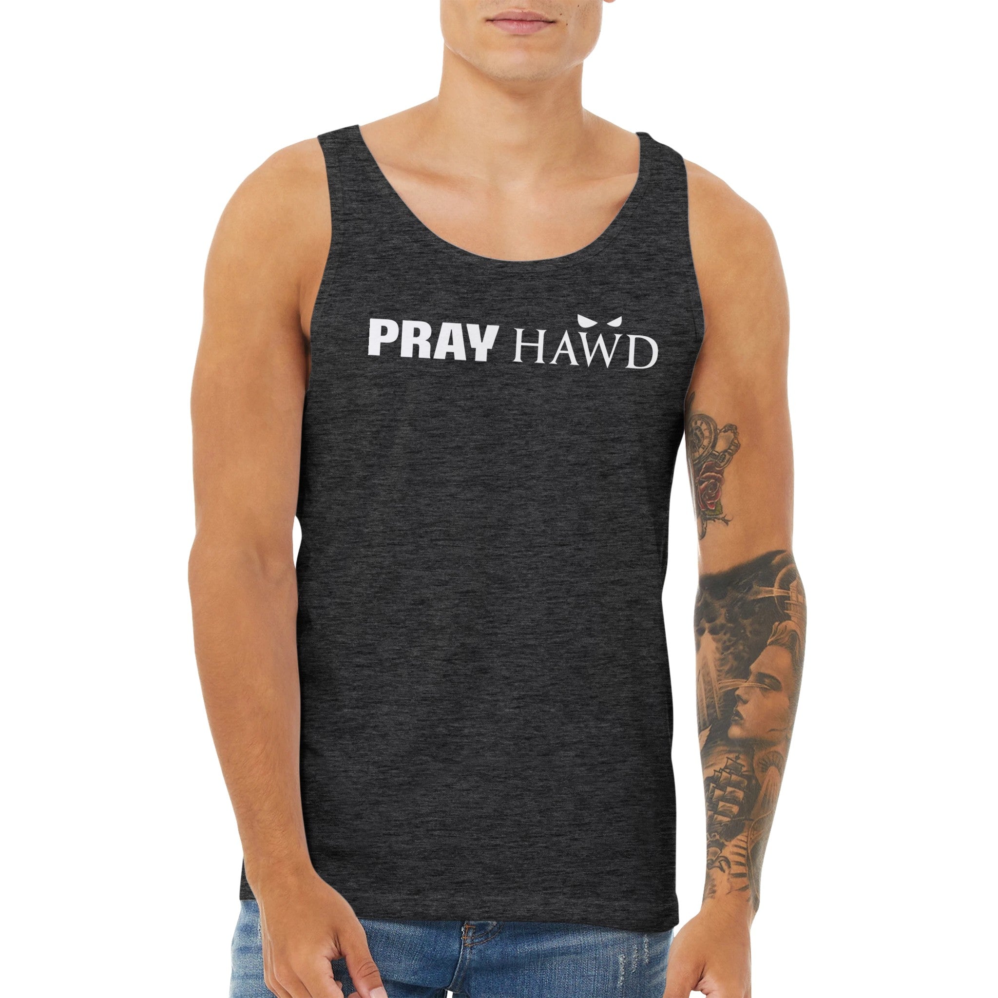 PRAY HAWD Men's Tank Top has a modern fit, featuring a rounded neck and designed with superior combed and ring-spun cotton that acts as a blank canvas for printing.