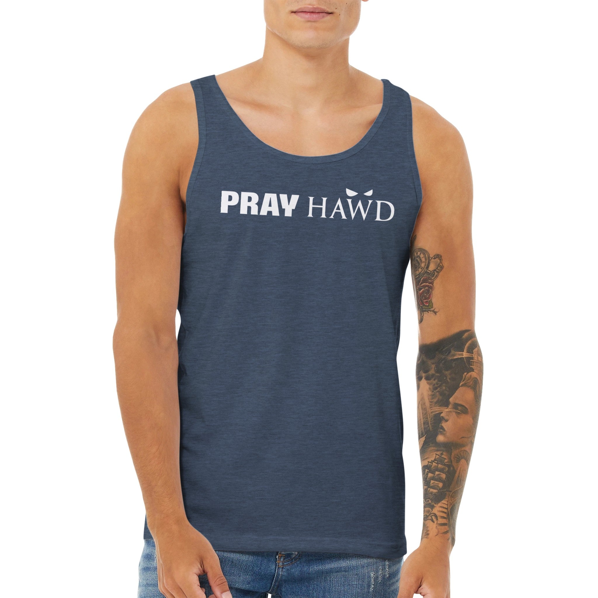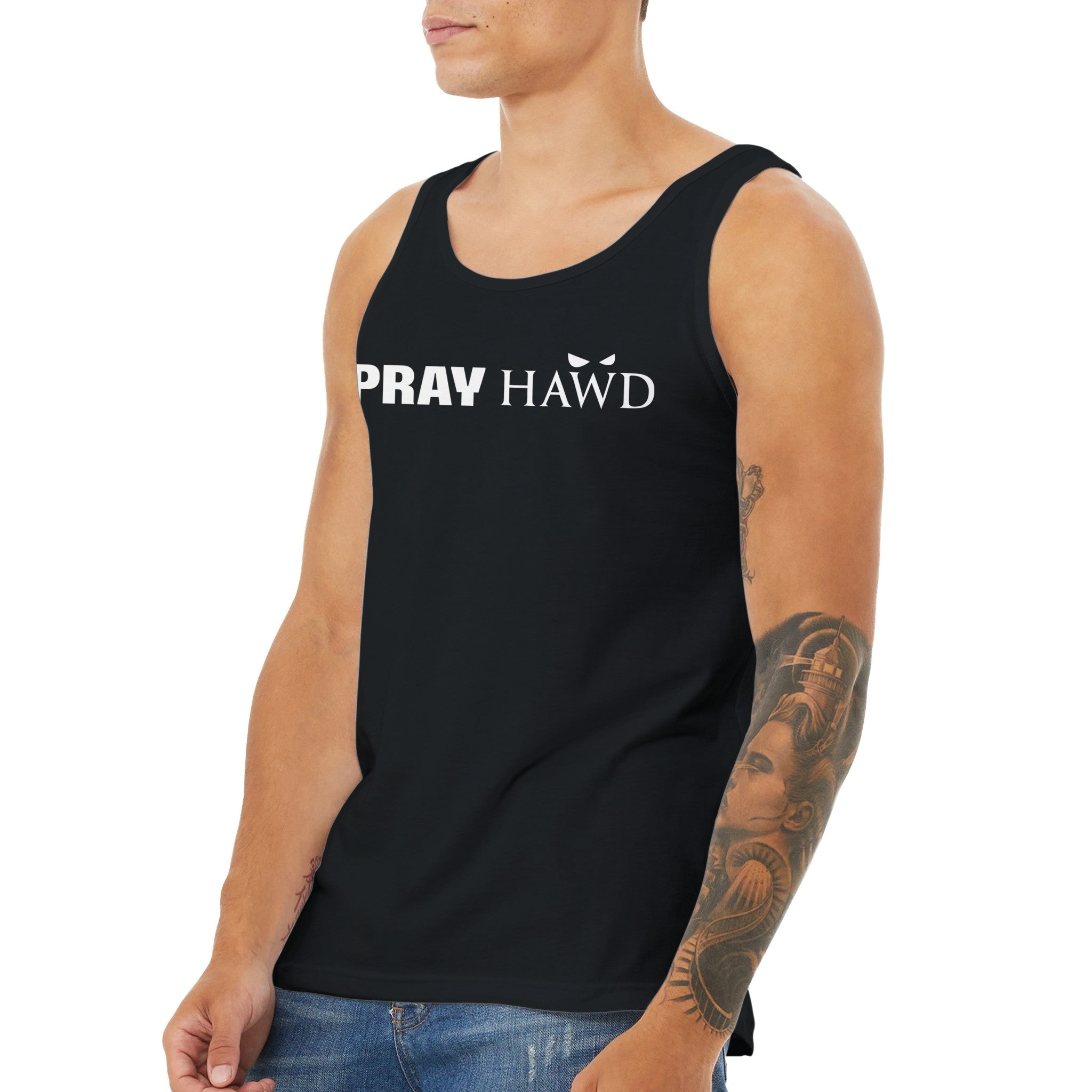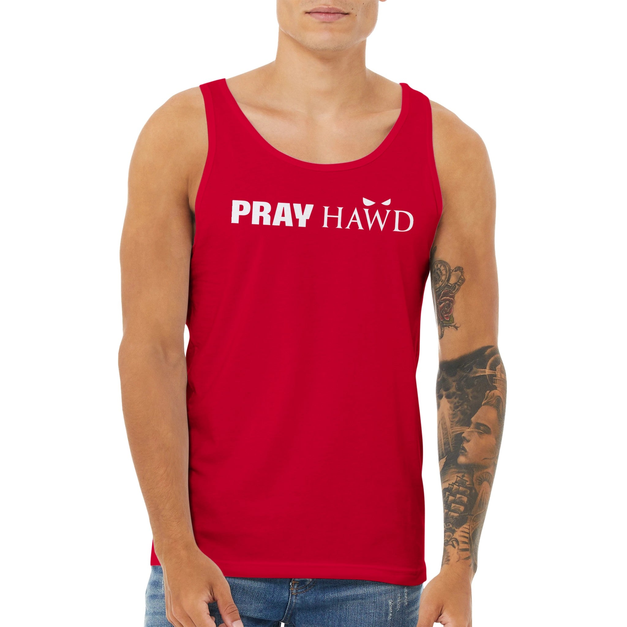 PRAY HAWD Men's Tank Top has a modern fit, featuring a rounded neck and designed with superior combed and ring-spun cotton that acts as a blank canvas for printing.